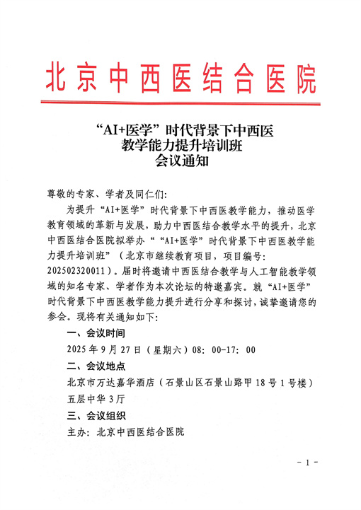 北京中西医结合医院“AI+医学”时代背景下中西医教学能力提升培训班会议通知